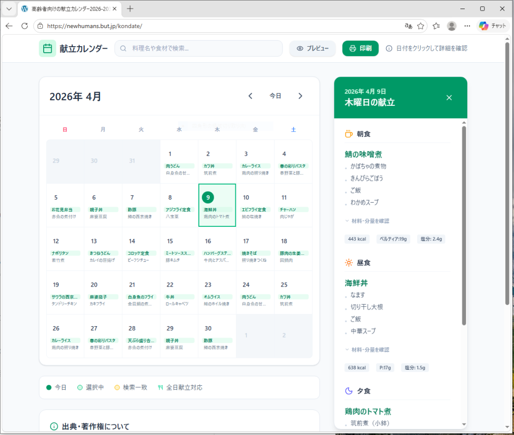 カレンダータイプの献立表と簡単にではありますが、食材やカロリーなどを一覧できるWEBサイトをご用意いたしました。親の介護をしながら働いている方にとって、食事のメニューを考えれるのは食事を作ることよりも疲れたりもします。そんなみなさんに参考にしていただければ幸いです。